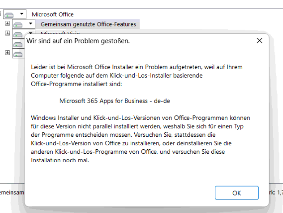 Ldier Quittiert uns der Installer das Office 365 Apps mit Click and Run installiert sind oder Umgekehrt, wenn zum beispi3el erst Visio installiert wurde und dann das 365 installiert wird. Meckert er das Visio an.