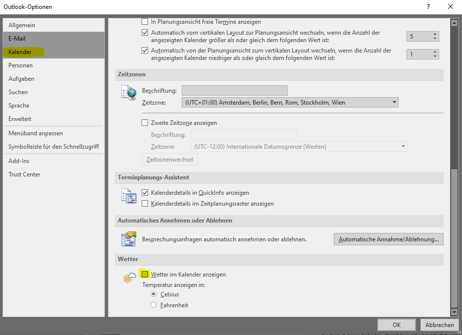 im Outlook auf Datei, Optionen – Kalender auswählen, runterscrollen bis „Wetter“, den Haken bei „Wetter im Kalender anzeigen“ rausnehmen und mit „OK“ bestätigen