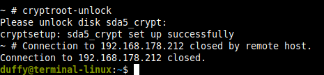 Nun per ssh verbinden (denkt daran port 12345ssh root@192.168.178.212 -p 12345in der busybox wird uns schon verraten das der Befehl zum entschlüsseln cryptroot-unlock ist