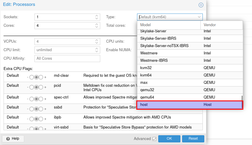 Wichtig das die VM die Nested benutzen soll, als CPU TYP Host hat.