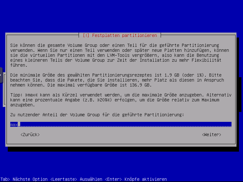 mit dem Wert max die gesamten Speicher für die Volumegroup nehmen