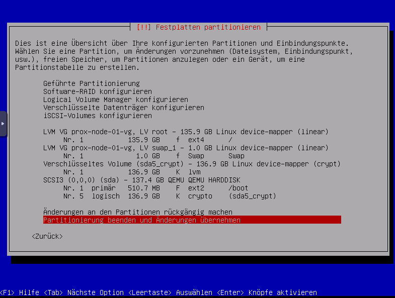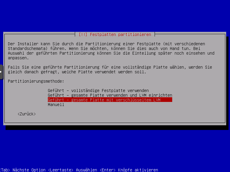 Soll verschlüsselt werden, dann gesamte Platte mit verschlüsseltem LVM auswählen.