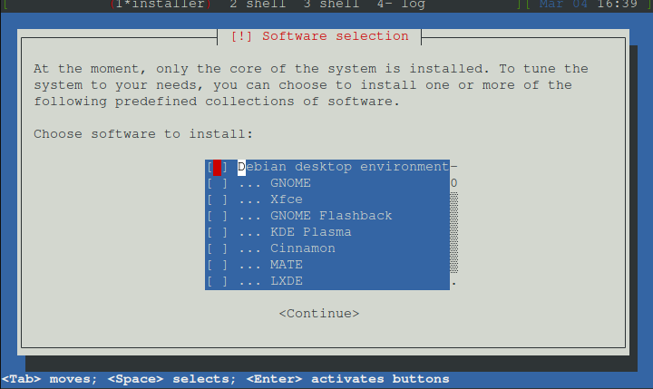 Nun alles abwählen außer SSH und Systemwerkzeuge und dann continue