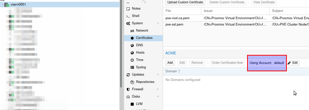 Auf der Weboberfläche einloggen, Dann auf Datacenter -> Acme gehen.