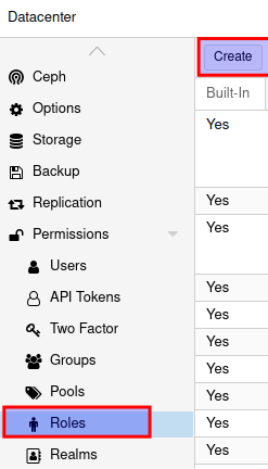 Dazu melden wir uns am proxmox an, gehen unter Datacenter -> Permission -> Roles und klciken dort auf Create