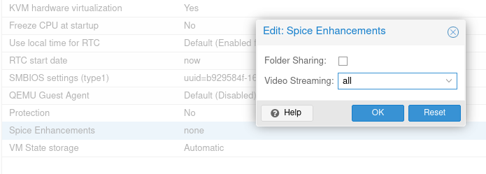 Unter optionen der VM kann man noch Spice erweiterungen Einstellen z.b Verzeichnis Teilen (wie bei Vritualbox oder RDP) und welcher filter eingestellt werden soll, falls Video Streaming betrieben wird.