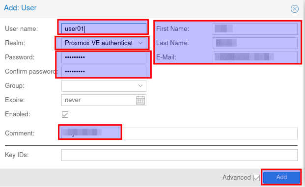 Wichtig das als Realm Proxmox VE ausgewählt und NICHT PAM.