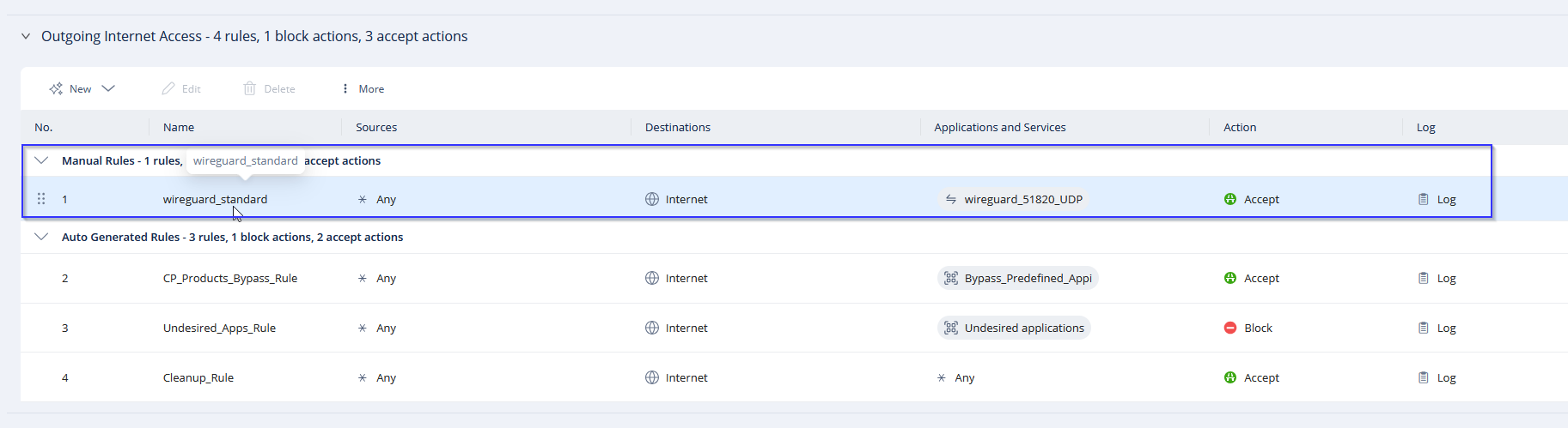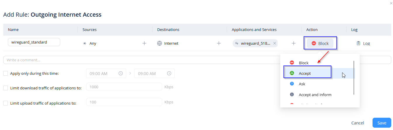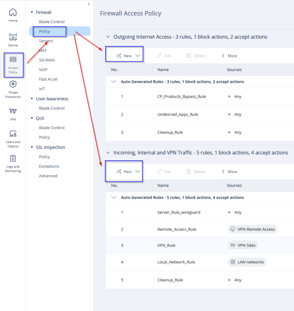 Auf Access Policy klicken -> policy -> Dann entweder bei Ausgehende oder Eingehende Regel auf New klicken, je nach dem was man will.