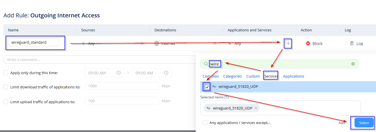 Die Ports die geblockt werden sollen müssen vorher als Services/Aplliaktionen angelegt werden.