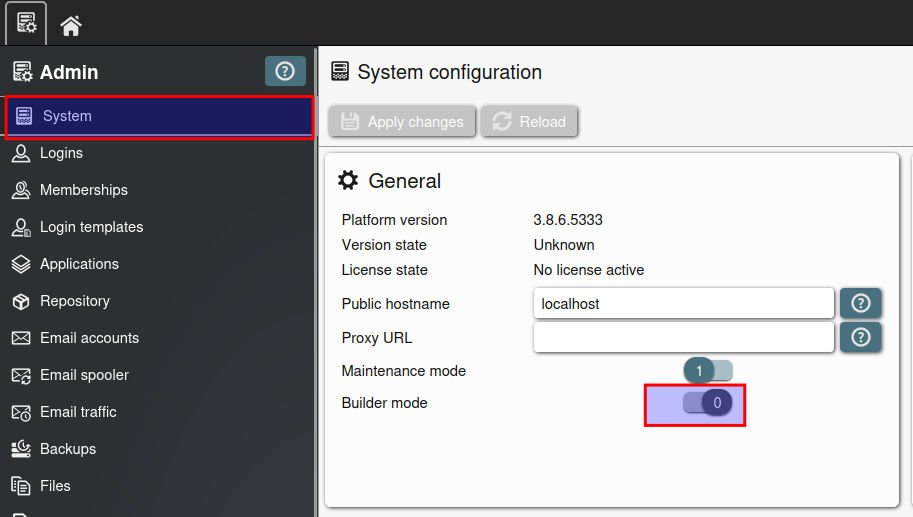 Nun gehen wir unter System und enabled den Builder mode, damit wir Apps bauen können