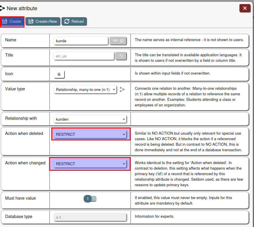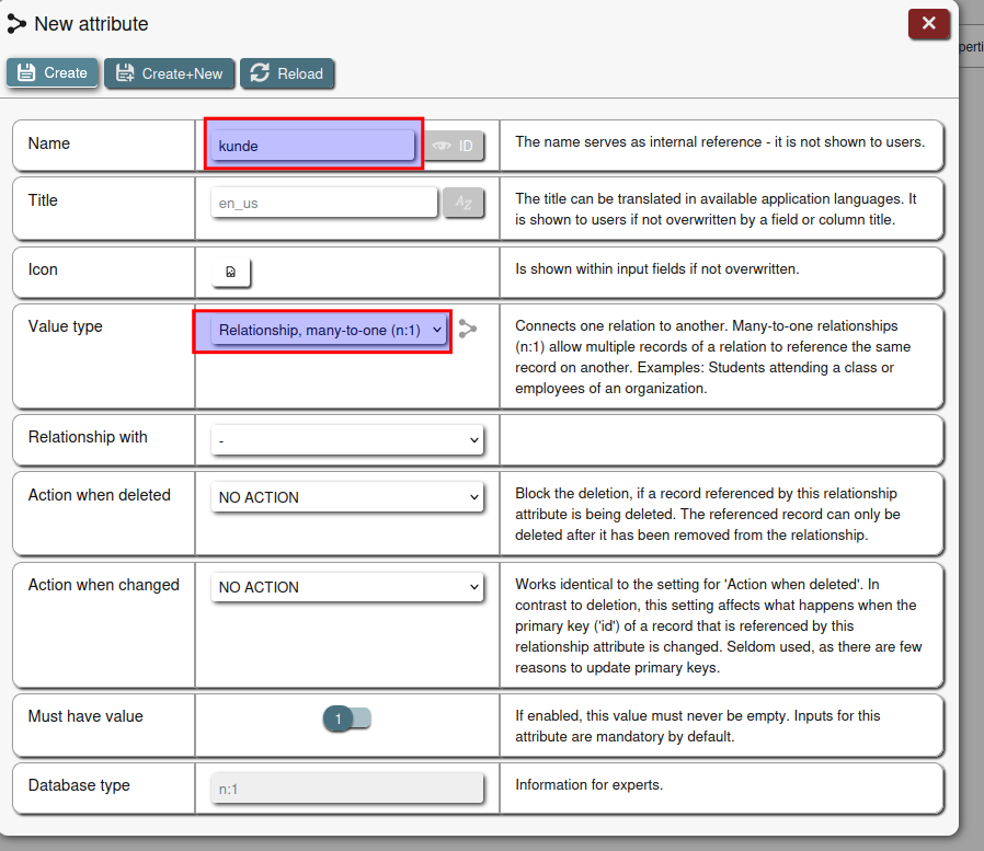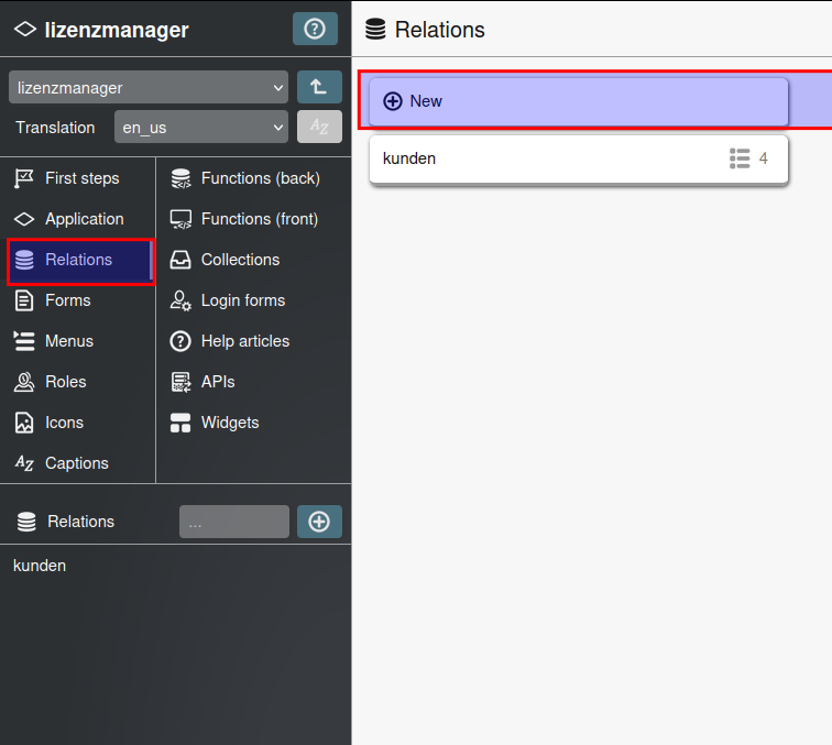Dazu im Menü links auf Relations klicken und dann wieder auf New