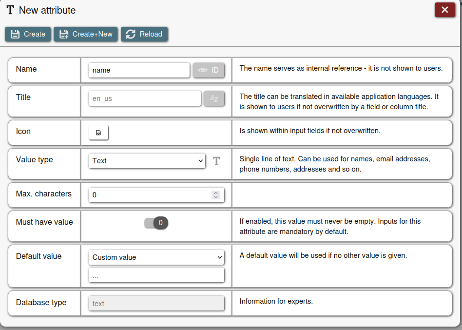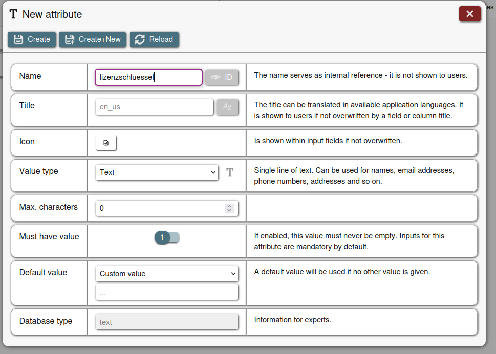Das erste Feld heißt lizenzschluessel und ist ein Pflichtfeld und typ text, create+new anklicken