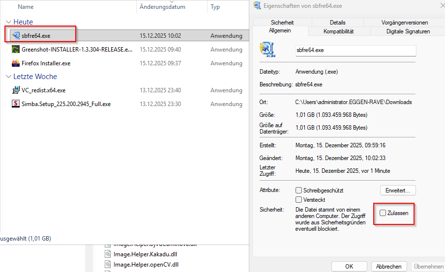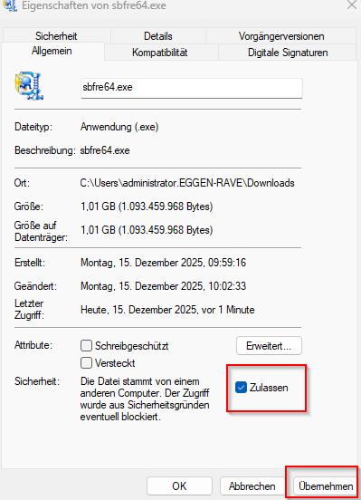 Dann rechtklick auf die heruntegeladene Datei sbfre64.exe und Eigenschaften auswählen.