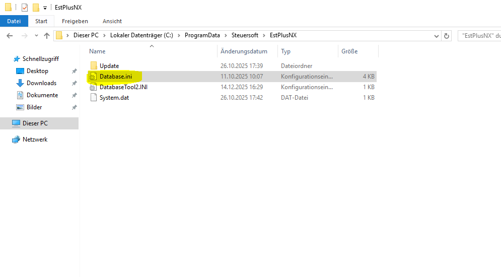 Unter "C:\ProgramData\Steuersoft\EstPlusNX" oder C:\ProgramData\Steuersoft\EstPlusSB" jw nach Version liegt eine database.ini