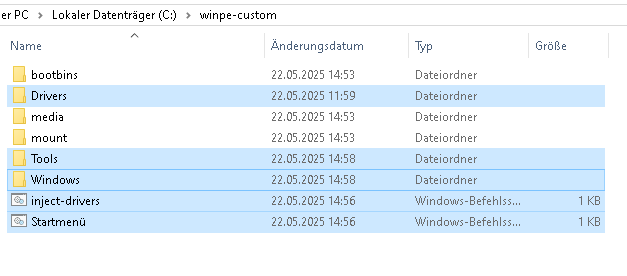 4. Kopiere die Dateien aus diesem ZIP vom verzeichnis custom (also inHalt von Cunstom): Windows-PE-Treiberpaket.zip ins c:\winpe-custom Verzeichnis