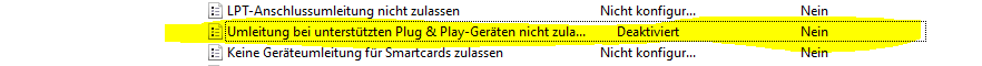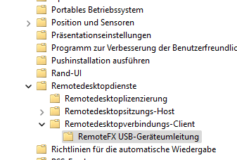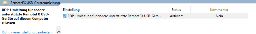 Dort dann RDP-Umleitung für andere unterstütze RemoteFX USB Geräte auf diesem Computer zulassen