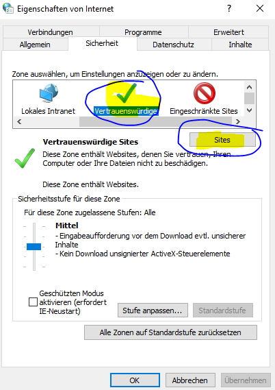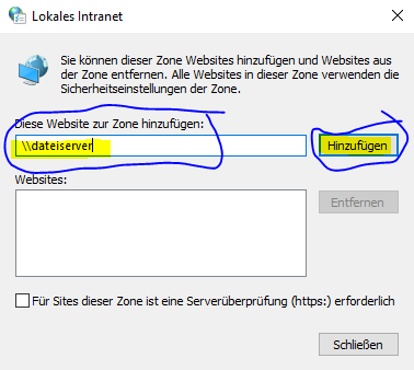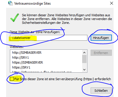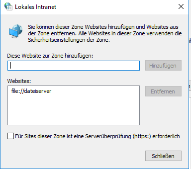 Wichtig, Haken raus bei Für Sites dieser Zone ist eine Serverüberprüfung (https:) erforderlich.