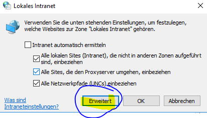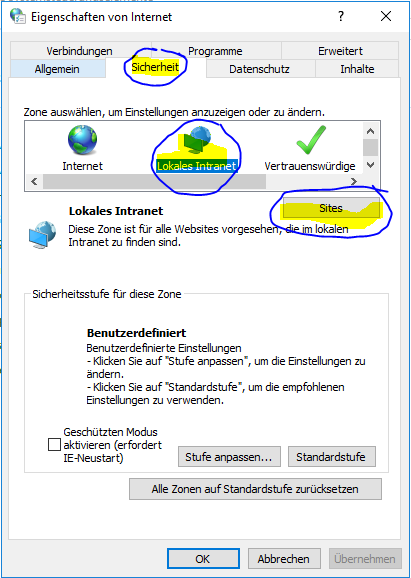 Dann auf Sicherheit -> Lokales Instranet -> Sites