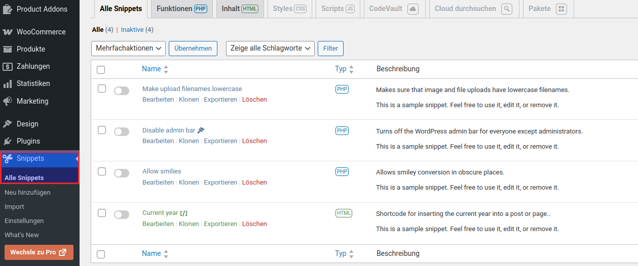Nach der installtion hat man links im Menü Snipptes und alle Snippets.