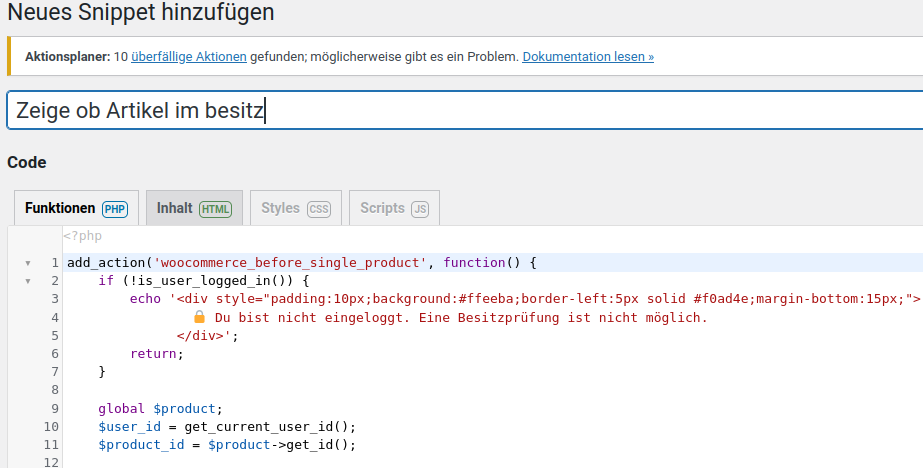 hier ein Snippet was prüft ob der Kunde den Artiekl in der vergangenheit schon mal gekauft hat.