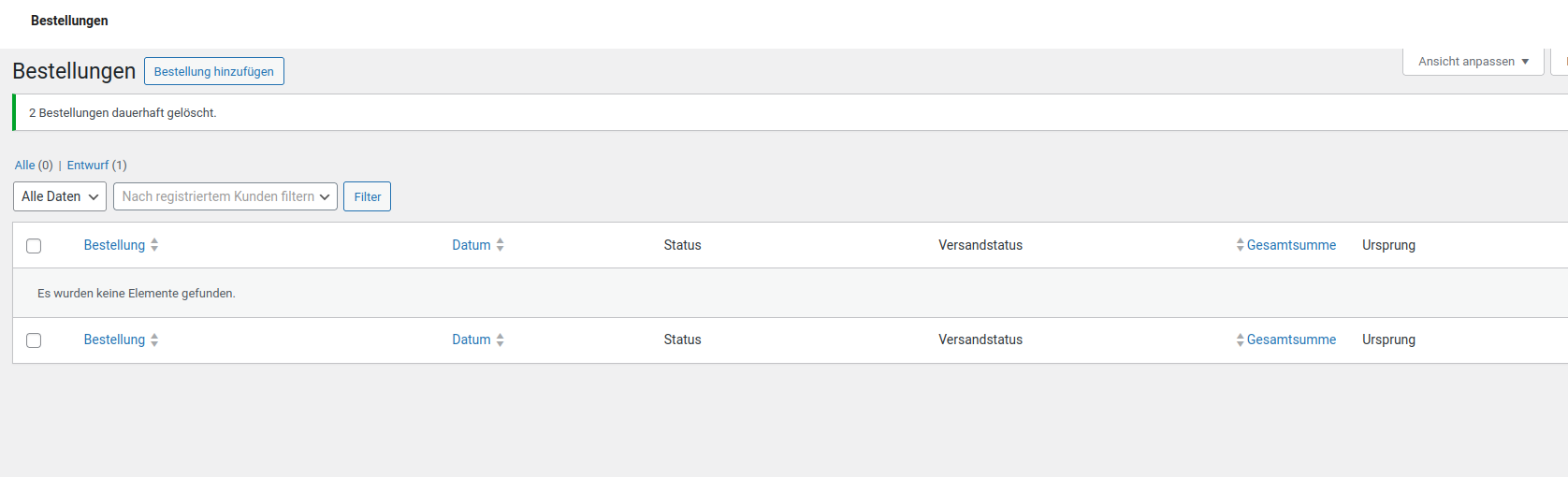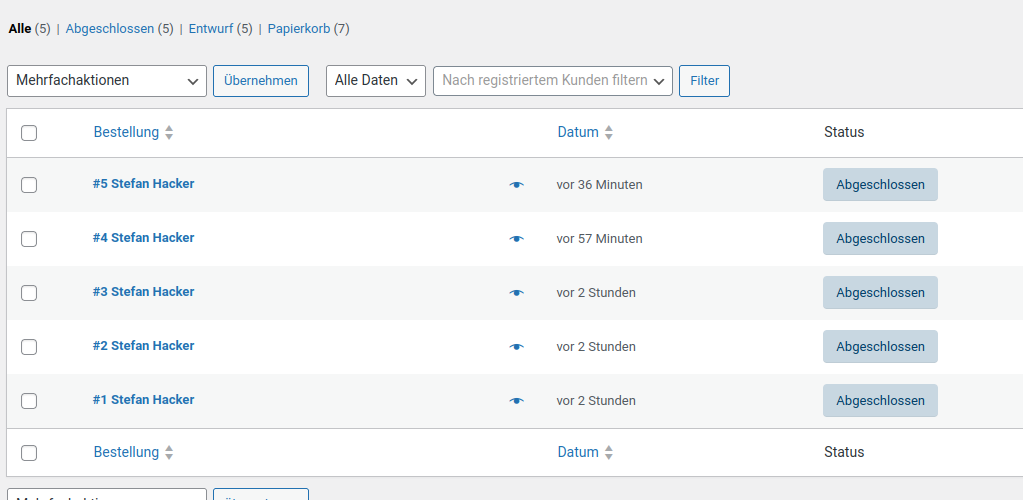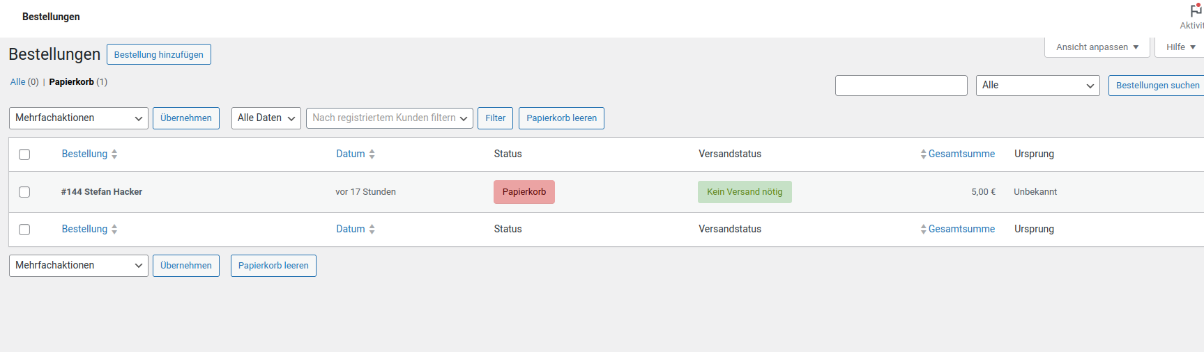 Erstmal alle Bestellungen löschen und den Papierkorb auch leeren: