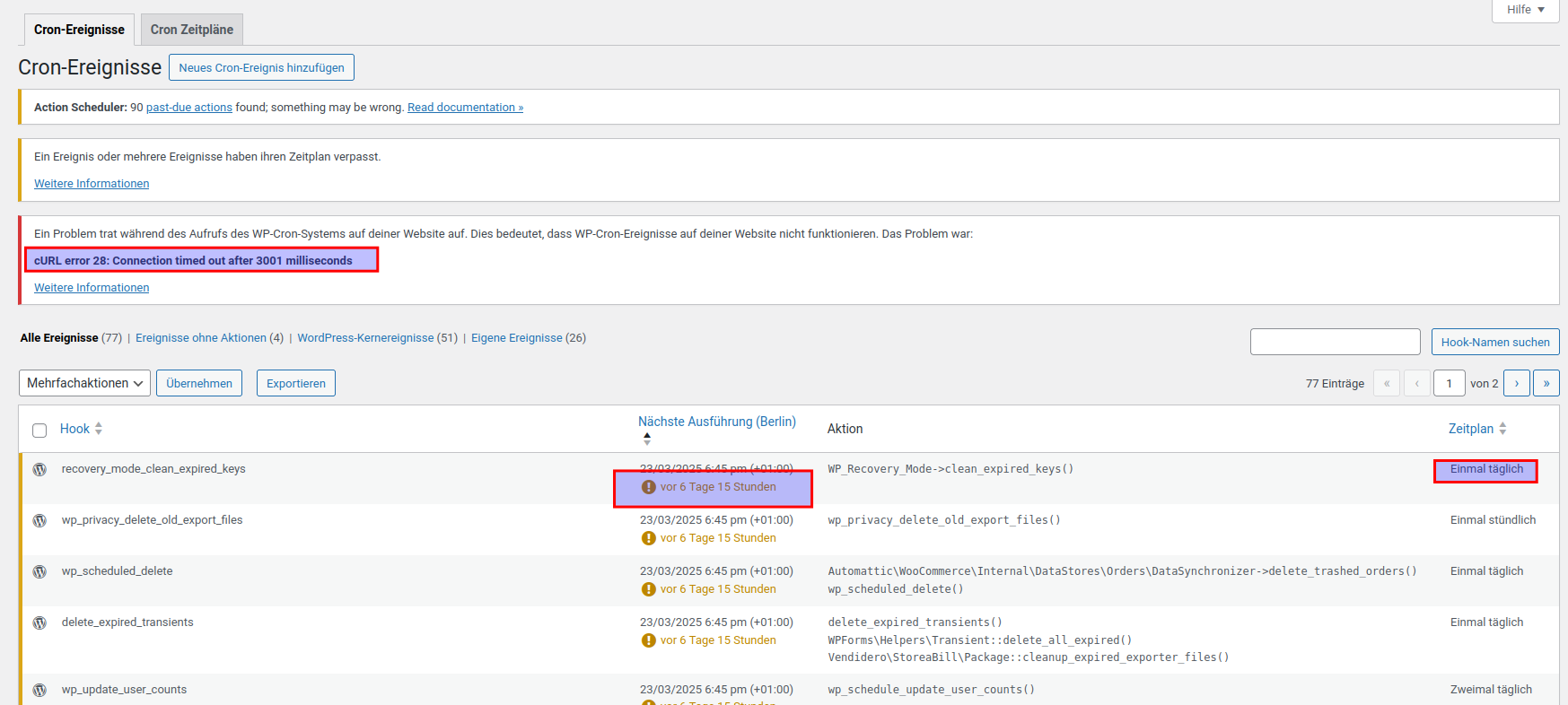 WP Crontrol berücksichtigt Zeitzonen, warnt Sie vor Ereignissen, die keine Aktionen enthalten oder ihren Zeitplan verfehlt haben, und zeigt Ihnen eine hilfreiche Warnmeldung an, falls Probleme mit Ihrem Cron-System festgestellt werden.